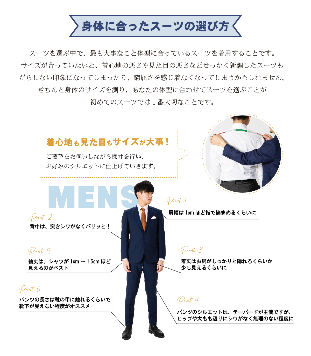 はじめてのスーツ選びを、しっかりサポート。 リクルート、成人式、インターン・・・...
